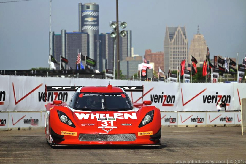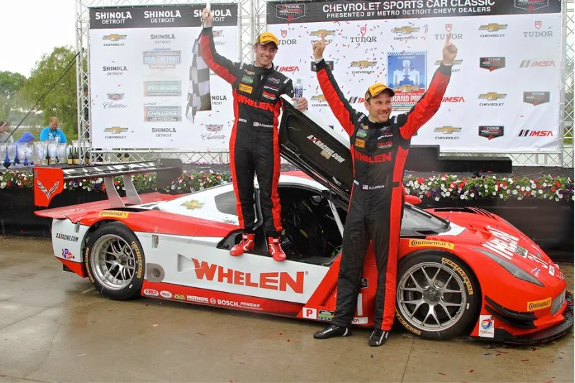 Eric Curran, stalwart driver for Sonny Whelen’s Corvette racing program since 2006 and new team driver Dane Cameron delivered the first overall win in a their C7 Daytona Prototype at Belle Isle on Saturday May 30. Track conditions were tricky from intermittent rain during the 2 hour contest.