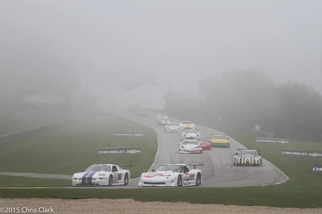 Low visibility and a damp track caused the race to start with a series of single file pace laps led by pole sitter Paul Fix. Fog and mist prevailed.