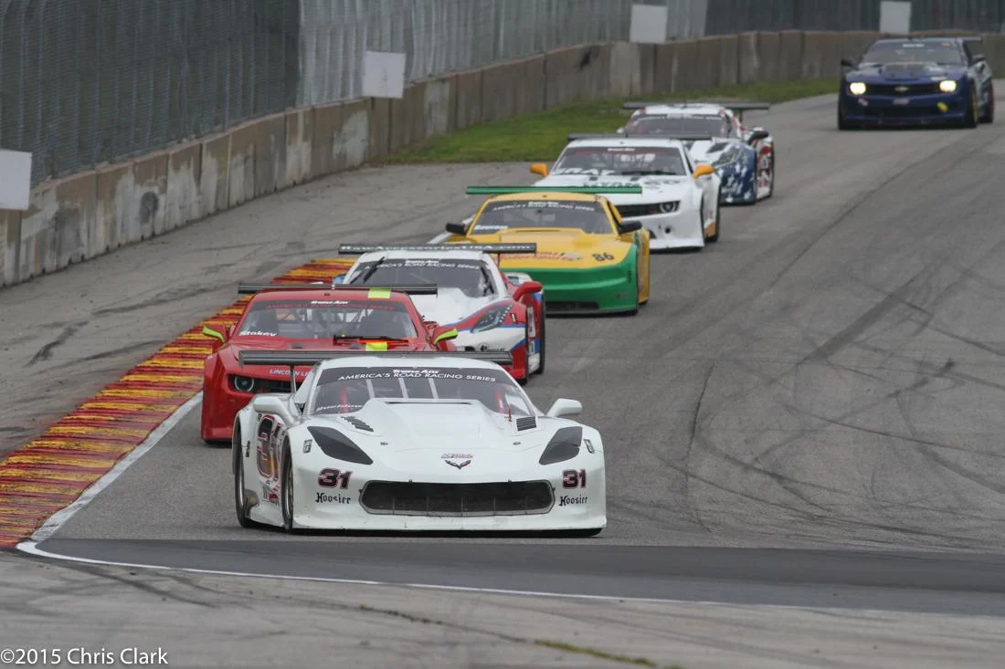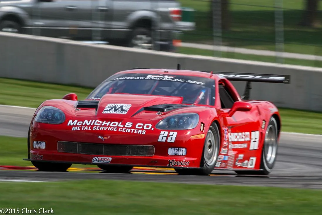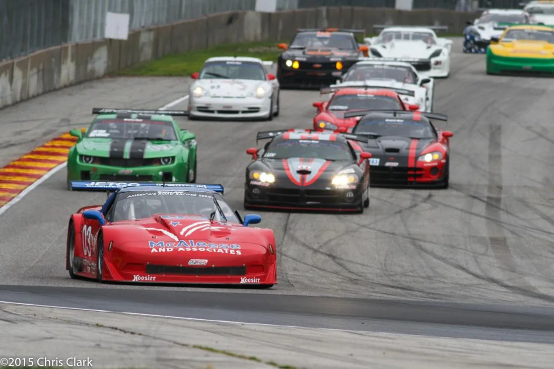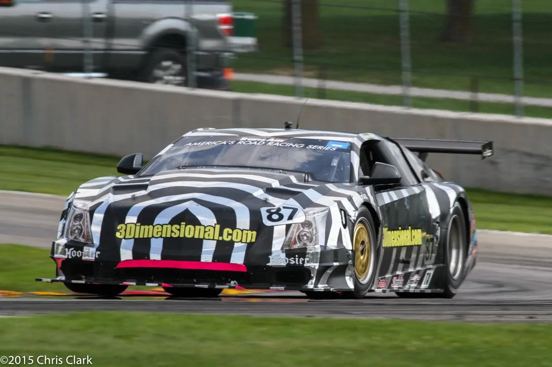 Local Mustang pilot Cliff Ebben had the lead until his tranny broke on lap 16. McAleese managed to pass the “Corvette” Caddy CTS-V of Doug Peterson while behind them several cars tangled and went off exiting turn 6 after the Corvette bridge. The race finished under yellow because there was not enough allotted time to clear all the stranded cars. (Who thinks the Caddy would look better with a blacked out grill?)