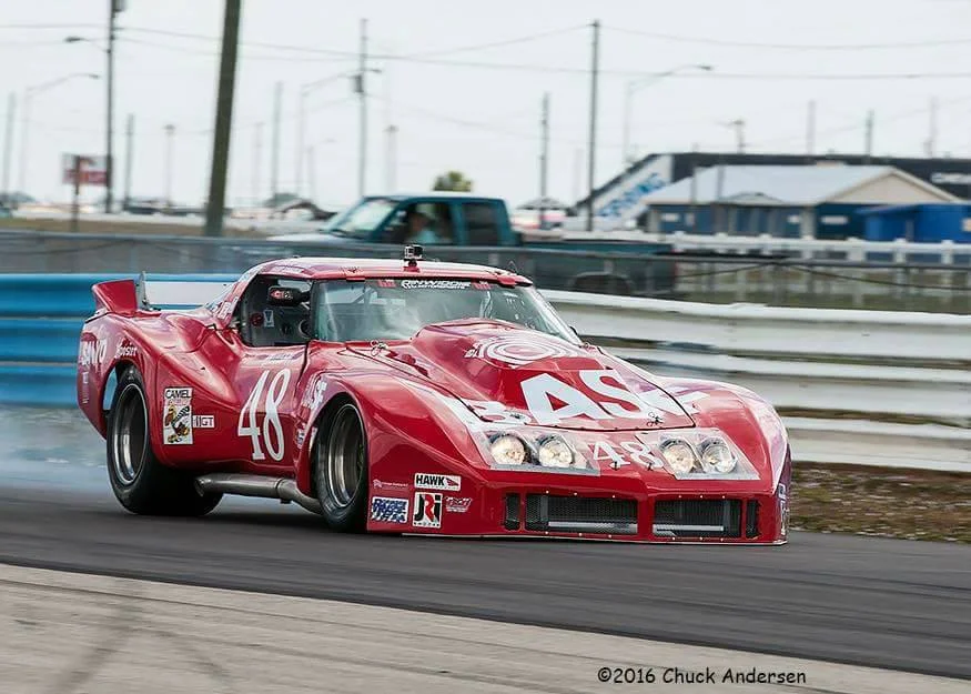 In Group B Aaron Quine, another veteran “shoe” qualified Harry Dinwiddie’s ex John Carusso IMSA # 48 Corvette on the class 2 pole. This car is one of the most documented C3 Corvettes on the circuit. It went out early when the engine spun a bearing.