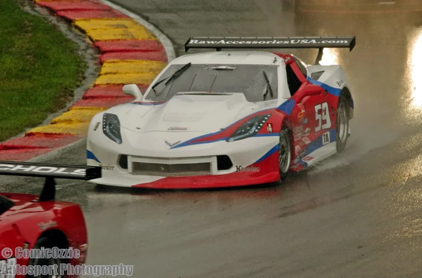 The winner was the # 36 Mustang Cliff Ebben, a local from Appleton WI who has raced for years and knows his way around Road America, rain or shine. He started on pole and led every lap. For the first time in recent memory a Corvette has not won a Trans Am race.