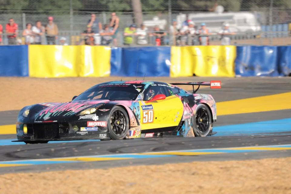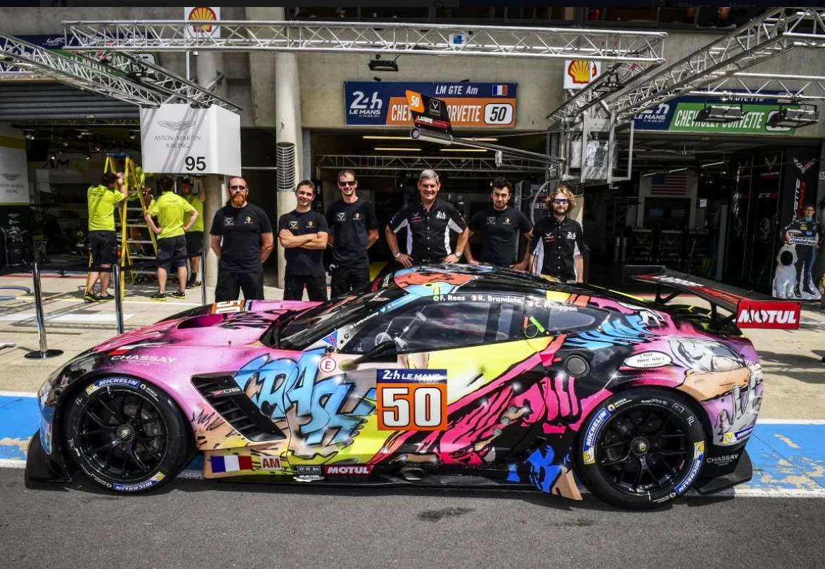 The # 50 Corvette showed up sporting day-glow “Human” artwork by Ramzi Adek. Failing to secure sponsorship for Le Mans (let alone the full WEC season), Jack LeConte made the most of it. His French Team Larbre surprisingly qualified first in the LMGTE AM class but finished last, deterred by contact with another car. (note right door was replaced). The venerable 5-year old chassis C7R 002 could be put out to pasture.