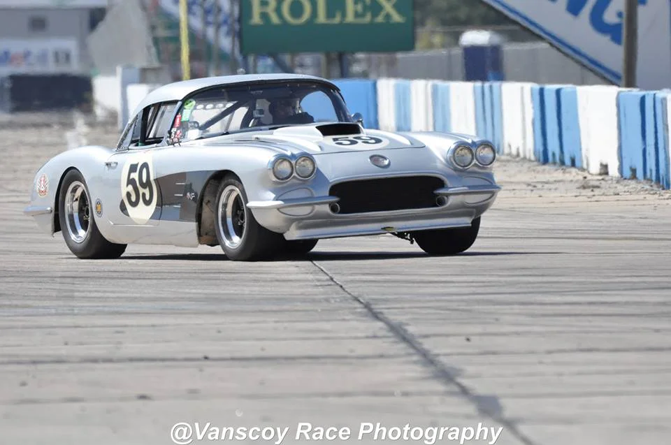 # 59 Bernie Chodosh fresh off the boat from the UK was a late entry in his tricked out C1 1959 solid axle Corvette that raced in Group 6.